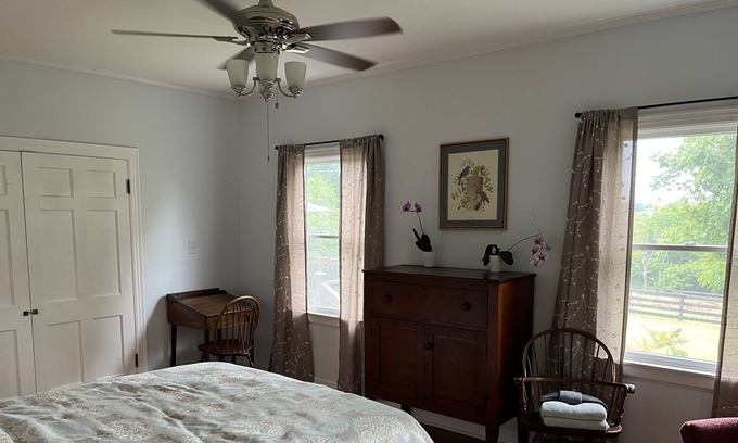 Farm with enriched history and landmarks. The Farm House has beautiful views. Enjoy pleasant walks along trails and tour beautiful gardens despersed though-out the farm. Its a 15-20 min. drive to town and local restaurants. A great place to stay if visiting Distilleries. It's located 5 min from Keeneland race track. Enjoy a barbecue with family on the deck, cool off with a swim and enjoy stargazing around a camp fire.