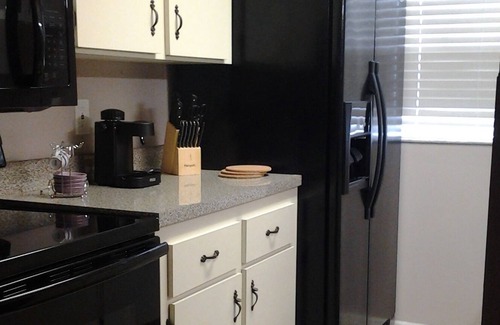 Our villa is one of four(4) units where the lanai backs right onto a patio that leads to the large swimming pool in the villa community. This spacious, private and quiet one-story villa accommodates up to two people. This villa 1 bedroom 1 bath and half bathroom it comes fully furnished with washer and dryer inside the unit. Parking in front of the unit...relax at the terrace looking at the trees of the patio