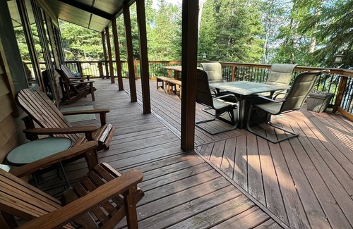 This water access only cabin is a quiet retreat from the busyness of life. Fast Starlink internet to keep you connected. Two bedrooms in the main cabin are accompanied by a full bathroom and fully stocked kitchen. The bunk house includes an upper bedroom with a queen bed and amazing views. The lower level includes two bunk beds sleeping at least four people as well as a 3/4 bath. Property includes an outhouse, outdoor shower, fire pit, two docks (one swimming, one with a lift), no steps from the water to the cabin, and 7 acres of remote forest. Cabin can be accessed via the public launch and is just a quick five minute boat ride.