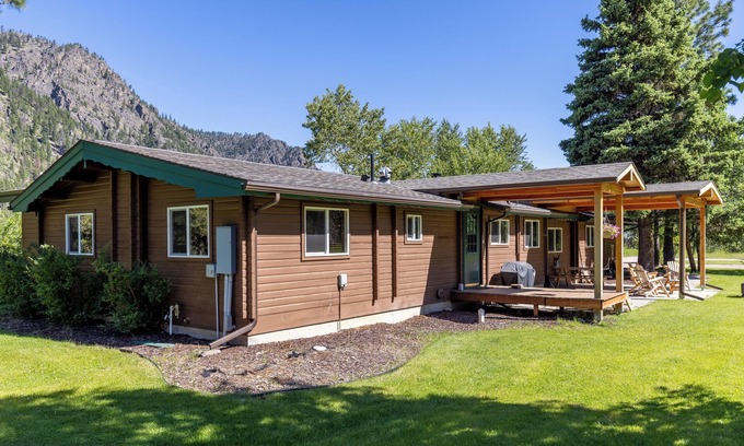 Brewster Creek Cabin was refurbished in 2019 after siting frozen in time for over 30 years – the former owners locked the door and seemingly never returned. Everything was amazingly intact in spite of sitting for so long, allowing the main focus instead of repair, to be update – and the owners did a wonderful job. They added on a bath to the master bedroom, updated the kitchen, enlarged the original bath, added on a covered patio and porch to the front, installed a gas insert into the fireplace and beautifully furnished and decorated the 1960’s Lindal cedar home throughout.