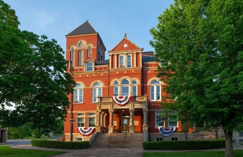 LIVING SPACE – Enjoy the abundant natural light streaming through the large windows that frame a stunning view of the picturesque Fayette County Courthouse. The comfortable living area has a sofa, desk, table, lamps, and smart TV. Dine at the kitchen high-top table.