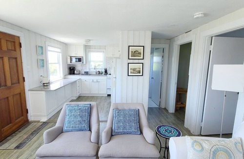 Enter a bright, open living area and kitchen. The living room has comfortable seating and a flat screen television with cable and WiFi. The picture window frames the beautiful harbor view! Enjoy amazing sunsets and the ever-changing harbor view right from the living room. The recently renovated kitchen is well-equipped and has an electric stove/oven and refrigerator.