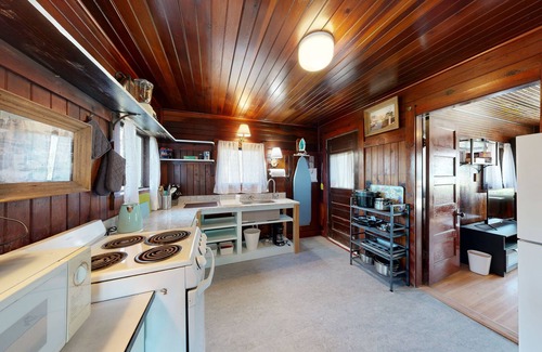 The interior is incredibly atmospheric, with richly hued wood paneling adorning the walls. Yet the space is also newly furnished and thoughtfully renovated, with the kitchen offering a new refrigerator, a new sink, new flooring, and new quartz countertops. Enjoy a living room with a smart TV, an air-conditioned sun porch where you can play board games by the window, and complimentary WiFi throughout the cottage.