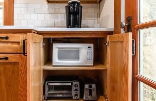 Cozy, historic, rock cottage, 240 sf. Huge front deck. Old hardwood floors, vaulted tin ceiling. Mini kitchen-farmhouse sink, tiny fridge, coffee, toaster. Modern mini-split heat pump cools, heats. Wood-burning stove adds a cozy, romantic touch. Back deck has views of pasture and horses. Set on 7-acre ranch. Quirk Alert! Bathroom is accessed outside front door 25 paces to back of cottage. Open shower for two. Rain shower head and wand. Exposed rock walls, concrete floor. No chemicals used so critter sightings possible.