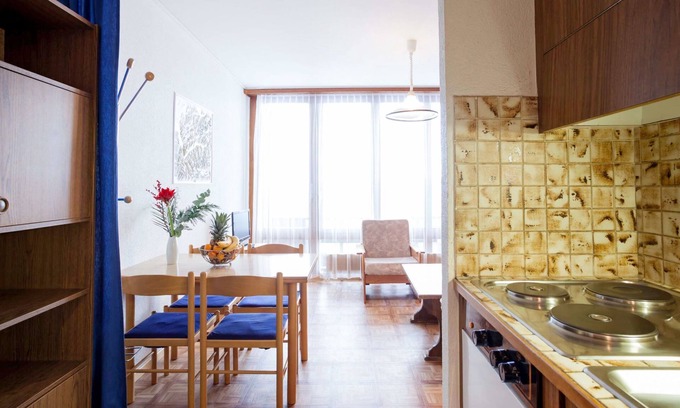"Résidence Greppon", 1-room studio 29 m2 on 3rd floor. Practical and comfortable furnishings: living/sleeping room with 1 sofabed (120 cm, length 190 cm), 1 double sofabed (140 cm, length 200 cm), 1 x 1 bunk beds (80 cm, length 190 cm), cable TV. Exit to the balcony. Open kitchen (4 ceramic glass hob hotplates, microwave). Bath/WC. Balcony, east facing position. Balcony furniture. Very beautiful view of the mountains and the countryside. Facilities: Internet (WiFi, extra). Please note: non-smokers only. Maximum 1 pet/ dog allowed.