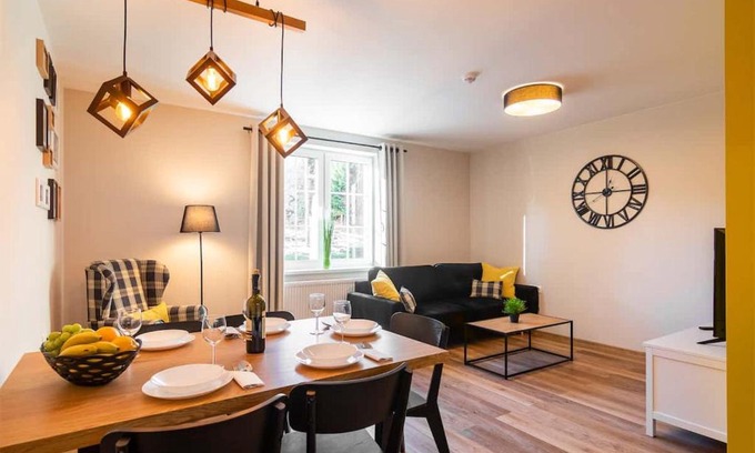 Róża Sudetów Apartamenty is located in Duszniki Zdrój, just 8.9 miles from Kudowa Zdrój Train Station and 10 miles from Polanica Zdroj Train Station. The property is around 4.5 miles from Chopin Manor, 7.6 miles from Aqua Park Kudowa, and 9.4 miles from Polanica Zdrój Mineral Water Pump Room. There's an outdoor fireplace and guests can use free Wifi and free private parking. The apartment consists of 2 bedrooms, a living room, a fully equipped kitchen with a dishwasher and a coffee machine, and 2 bathrooms with a shower and a hair dryer. Towels and bed linen are featured in the apartment. The accommodation is non-smoking. For guests with children, the apartment offers indoor and outdoor play areas. Guests at Róża Sudetów Apartamenty can enjoy skiing nearby, or make the most of the garden. Chess Park is 10 miles from the accommodation.