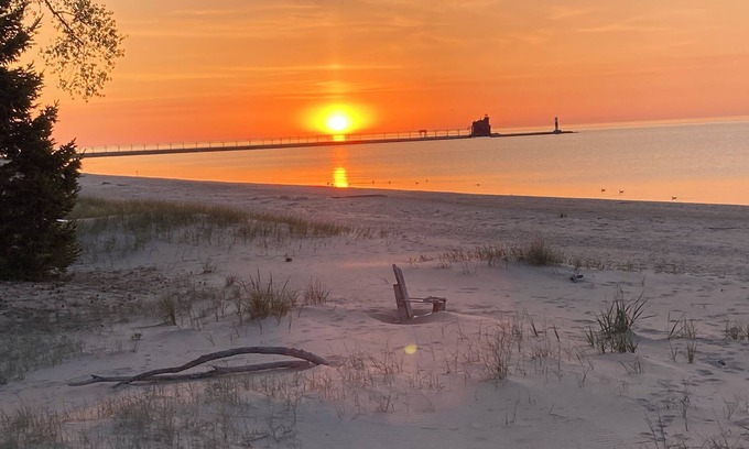 Our Cottage is only 10 minutes from downtown Sturgeon Bay and yet offers the Cozy atmosphere of a recently blacktopped one lane rustic road and friendly neighbors. Our Sand beach is Awesome, Great for those morning walks to watch the sunrise with your pet and when the full Moon rises at dusk . This area has been a favorite for tourists for almost 100 years and they keep coming back sometimes permanently. A short walk to to the pierhead Lighthouse and just down the road from The Sturgeon Bay Ship Canal Land Trust hiking area with excellent walking trails. Pet friendly with 2 bedrooms with queen-size beds, 2 couches and a rollaway bed comfortable for 4 adults . We have Central Air conditioning and heating for year round comfort. The inside of the cottage has been completely updated keeping with the Historical character of the original Cottage using locally grown lumber whenever possible. There is wood burning fireplace for those cool nights, a screen room off the kitchen and a small front patio out front and a firepit on the beach to relax outdoors . For our security, There is a outside security camera overlooking our parking areas and back yard.