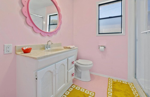 You’ll notice the fun bubblegum floors in both bathrooms, matchy-matchy with the kitchen. Fantastic pink 70s inspired floral towels, pink make up towels & colorful built in shelving are a few extras that make these bathrooms tops! The back bedroom bathroom has a stand up shower and the other bathroom has a shower/tub. Shampoo/Conditioner/Body wash dispensers in showers.