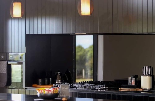 Set on 1.5 acres of secluded landscape, the South Wing features a cozy bedroom with a Japanese-style queen bed for a unique stay. Our South room has a modern allocated bathroom right next door. The luxurious shared space offers guests shared access to a fully equipped kitchen, Luxuruous open plan Lounge, Barrel spa, Ice bath as well as Laundry, home barista coffee machine & quality books. Take a breath & enjoy a barrel spa & outdoor shower while submitting to the display of nature