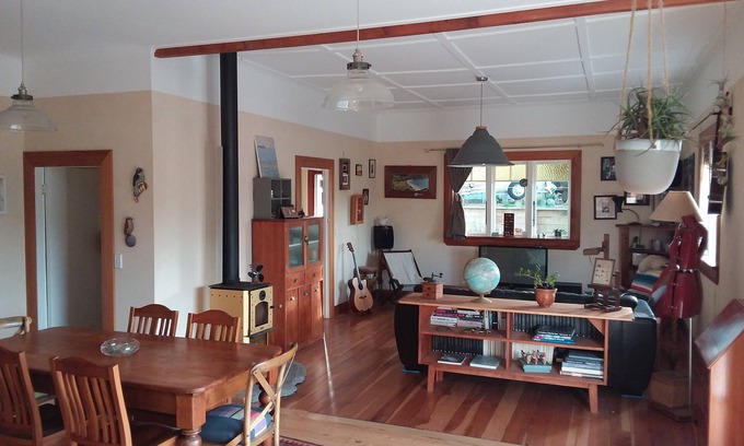 Fully and freshly renovated caracter old weatherboard house. Attention has been paid to details. Very warm feel throughout. If you have an artist soul or simply love caracter houses this one is for you! One main bedroom with ensuite and super king bed. One bedroom with 2 king single beds. One bedroom with a king bed. Polished wooden floor and brand new carpet in 2 bedrooms. Gas hot water so everyone can shower from returning from the beach. Walking distance from town or the beach.
