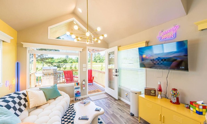 But the true highlight of our tiny home lies outdoors, where you'll find your private oasis awaiting. Gather around the large wood-burning fire pit for evenings spent swapping stories under the stars or fire up the barbecue grill for a sizzling cookout with friends and family. With a picnic table and ample seating, there's plenty of room to dine al fresco and soak in the serene surroundings.