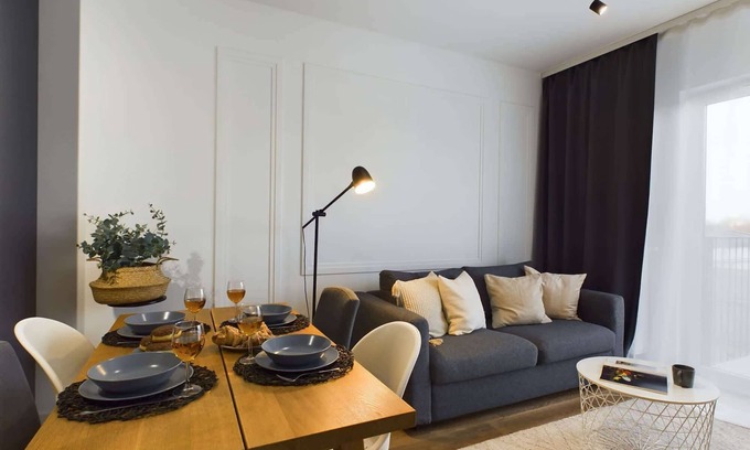 This fully equipped apartment is suitable for 4 people. The living space comprises a living room with a kitchenette, a separate bedroom and a bathroom with a shower. The décor in modern yet cheerful style combines dark furnishing with light wooden decorative details and hardwood floors. This place can become a real sanctuary for any stay in Kraków, a place to fully relax, thanks to functionality and a full range of amenities. The apartment has a cozy balcony from the quiet street side, ensuring peacefulness of a stay. Amenities include multimedia (a free wireless internet connection and a flat-screen TV) and essential kitchen and bathroom appliances (a dishwasher, a washing machine, a microwave). For a good start of a stay, there’s a welcome package of complimentary toiletries, towels and bedclothes.