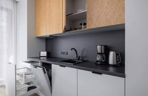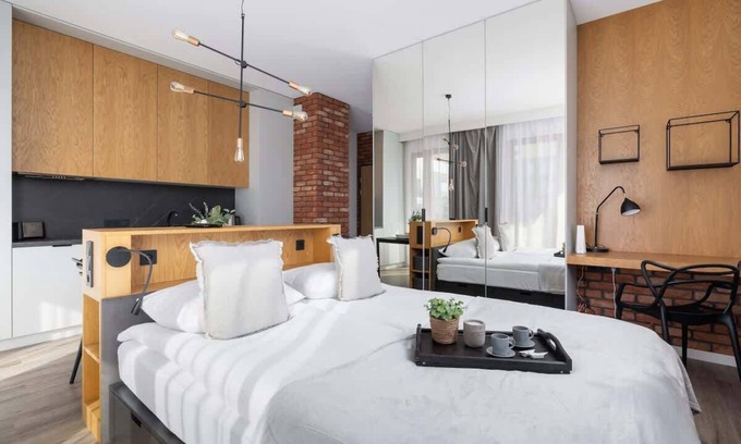 The modern studio is designed for 2 people. Therefore, it is a great solution for a couple or for business purposes! The studio consists of a seating area, a kitchenette and a bathroom with a shower and toilet. The apartment also has a cozy furnished balcony overlooking the inner courtyard. The studio offers a very comfortable double bed, a spacious mirrored closet, as well as a desk, so guests working remotely will be able to take care of business duties in comfort. Amenities include essential kitchen and bathroom appliances (coffee maker, hair dryer, washing machine) and multimedia (free Wifi connection, flat-screen Smart TV). To make guests feel at home from the moment they cross the threshold, the apartment includes a welcome package with complimentary toiletries, towels and linens. The facility's space is functionally designed, meeting all the needs of guests. Superb modern amenities translate into a high standard of stay. The trendy decor with raw brick walls, wooden details and new furnishings seamlessly blends elegant and contemporary style. There is also a fan in the apartment, which will provide some cooling, especially on warm days.