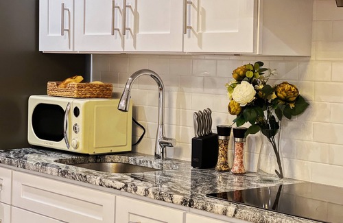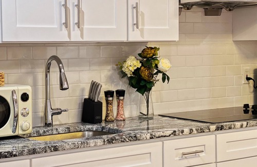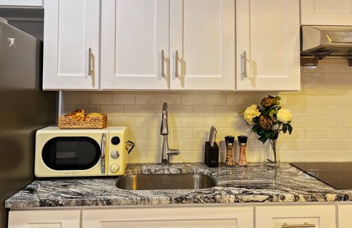 Our full-kitchen is equipped with a refrigerator, stove, microwave, coffee maker, and all the necessary cookware and dining essentials. The adjacent dining area is perfect for enjoying your home-cooked meals.