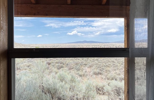 The house stays cozy warm in winter with radiant floor heating, a woodstove, and plenty of solar gain from all the windows. Summers in Taos are usually comfortable, and the main house has one split AC unit to cool the living area on the warmest days. Multiple fans are provided for both the house and cabin.