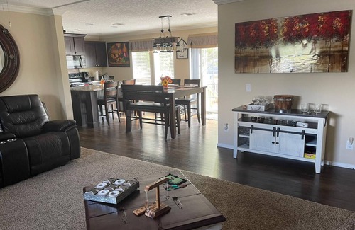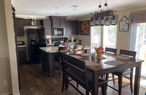 This is a 3/2 home with a dining room, living room and a fully equipped kitchen. The entire 1 ¼ acres home with attached outdoor deck, is completely closed in with a privacy fenced with 2 gate entrances. With a nice patio with fire pit with seating (bring fire wood if you plan to use it), 24 hours POOL(ALL PERSONS USING THE POOL DO SO AT THEIR OWN RISK, OWNERS AND MANAGEMENT ARE NOT RESPONSIBLE FOR ANY ACCIDENTS OR INJURIES),TIKI HUT, a bocce ball court, playground, and a hole yard where all your toys can fit on this secured property. Plus you have access to park boats, trailers, RV’s and ATV’s with a separate place to charge, wash and clean all of theses.