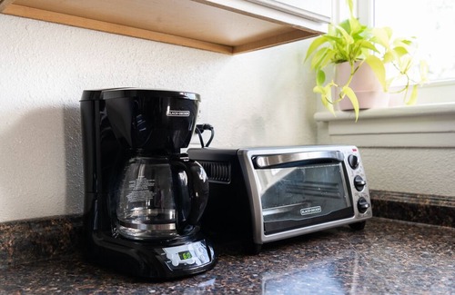 - Full kitchen with coffee maker, toaster, essential utensils, and cookware