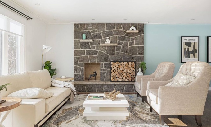 Design: An open-concept bungalow bathed in natural light, featuring high-end finishes like quartz countertops, oak hardwood floors, and marble tiles.