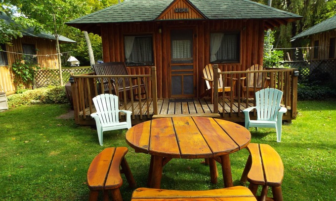 It is an absolutely charming studio log cabin at Au She Gun Resort on beautiful Lake Leelanau. This enchanting cabin is fully updated, with a fully equipped kitchen, and bath, but its vintage log interior and tranquil natural setting still provide that rustic "Up North" feel.