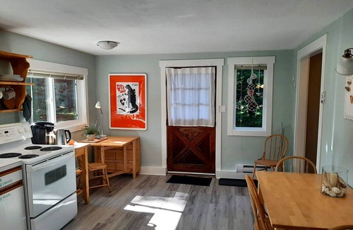 The guesthouse shares the driveway to our family's home and is located on the back half of our property. The kitchen (which has Venetian blinds for privacy) views part of our backyard, where at times my children play, but is otherwise private and separate. It has its own patio with privacy screen and cedar hedge separating it from our yard. You might at times hear children playing, but we do our utmost to respect your privacy.
