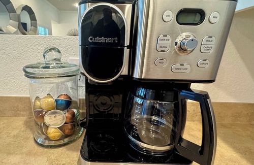 Fully Equipped Kitchen: Our kitchen is stocked with everything you need to prepare meals, including pots, pans, dishes, silverware, linens, a coffee pot, toaster, and serving accessories.