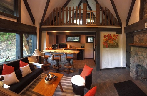 The charming Chalet can be enjoyed as a romantic getaway for a couple who will find their master suite downstairs and a living area and compact kitchen above, or for family visitors, there is the awesome carpeted loft area with two twin beds. The main floor also has a queen size sleeper sofa if you need it, along with a powder room.