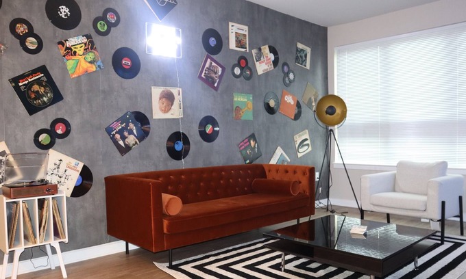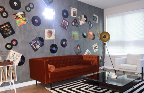 Curl up on the sofa in our eclectic music themed 1 bedroom apartment. Our place is scattered with album art, wall-mounted records, and an old fashioned vinyl player! Located in central Fairfax, with a grocery store, a café on-site, numerous shops and eateries within walking distance, staying at our place is a no brainer!