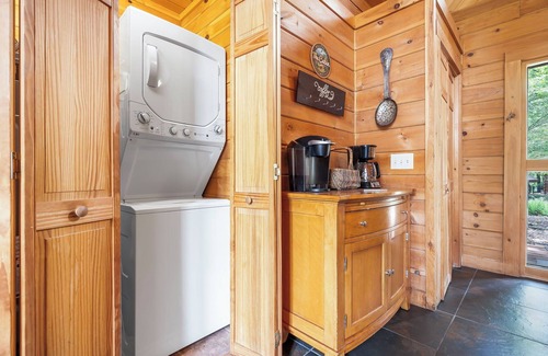 Take the path up through the flower garden to your home away from home! Upon entering, you will find a fully equipped kitchen where you can whip up delicious meals. Head onto the deck where the private grill awaits to add to your savory creations. The living area is complete with comfortable furniture, a flat-screen TV, and a circular, wood-burning fireplace. The master bedroom offers a king bed and ensuite with a jacuzzi bathtub and shower. Slip out the french doors, onto the deck for a soak in the hot tub. There are two queen bedrooms, one with deck access and the other is perfect for the 'little bears' of your group!