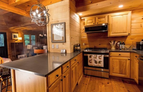 The cabin has been recently remodeled embracing a contemporary design that mixes modern furniture with antiques. It also offers comfortable furniture, real pieces of art, and a fully stocked kitchen with an open island and a dining table to host family and friends. The second level also offers a dedicated work area with a large computer screen to make your working sessions more productive and efficient.