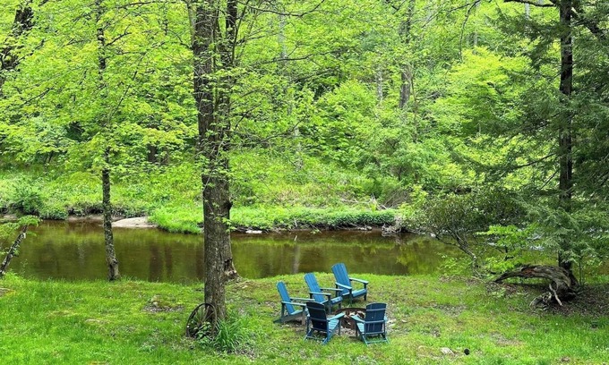 The cabin sits on five secluded acres of an old-growth private forest along a tranquil creek that ends on the Delaware River. This retreat offers an unparalleled creekfront experience, making it a paradise for children and adults alike. It is located at a 12 min short drive to the town of Narrowsburg, in the NY Catskills, at 19 minutes to the town of Callicoon, NY and the Upper Delaware River. Each town offers an assortment of restaurants, bars, shops, galleries and activities throughout all the seasons of the year. The cabin is also situated at a 5-min to the historic General Store in Milanville, PA, where you can find all the essentials you need.