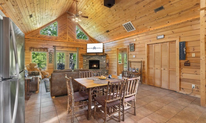 The great room at Fairway View provides comfort and ambiance with a seasonal wood-burning fireplace and plush furnishings. Stay up to date on your favorite shows with the provided cable and free wifi. The open-concept living space allows seamless flow into the fully equipped kitchen. When you are ready to share stories over a scrumptious meal, head into the dining area or out on the back deck which overlooks a meadow, water fountains, and numerous trees. Relax and recharge while soaking your worries away in the sparkling hot tub or next to the crackling firepit.