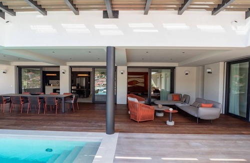 At the facade, a splendid infinity swimming poolsparkles under the golden sun which makes it perfect for sunbathing or reading your favorite book on one of the sun loungers or deck chairs, facing the lively Gustavia harbor. You will love spending time here especially during regattas times such as the Voiles de St-Barthsor the Bucket Regatta.