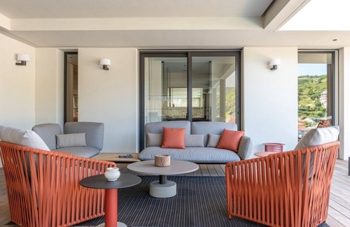 The living room is composed of comfortable sofas, linen, and ochre-colored armchairs, as well as a HDTV for pleasant movie nights. Modern and contemporary, this living space connects the kitchen that is fully equipped with an oven, microwave, refrigerator with ice maker, dishwasher, blender, toaster, filter coffee maker and Nespresso machine, kettle, stove, and a bar with stools. The space also features a dining area with a stylish, elegant, and luxurious setting, in a chic and private atmosphere ideal for talking or simply relaxing.