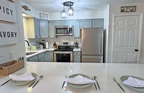 * Fully stocked kitchen with quartz countertops, breakfast bar, subway tile backsplash, stainless steel appliances, dishwasher and a dining area with space for eight people plus a breakfast bar with space for four people. Additional appliances include a drip coffeemaker, toaster, ample supply of pots & pans, Crockpot, blender, microwave, bakeware, serving dishes, various kitchen utensils and all other basic cookware is provided! There is a set of children's cups and plates.