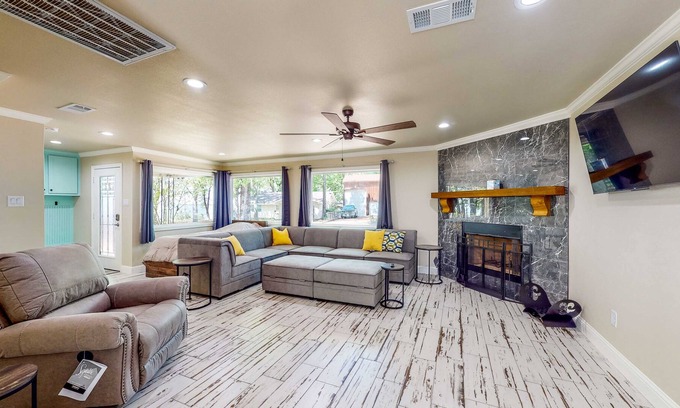 At your retreat, the sun-filled living room features soft seating, a fireplace, and a large TV, ideal for movie nights. The bright kitchen comes equipped with blue cabinetry and stainless steel appliances. The adjacent formal dining table is the perfect spot for family-style meals. For a fun family game night, enjoy the 500 square feet back patio.