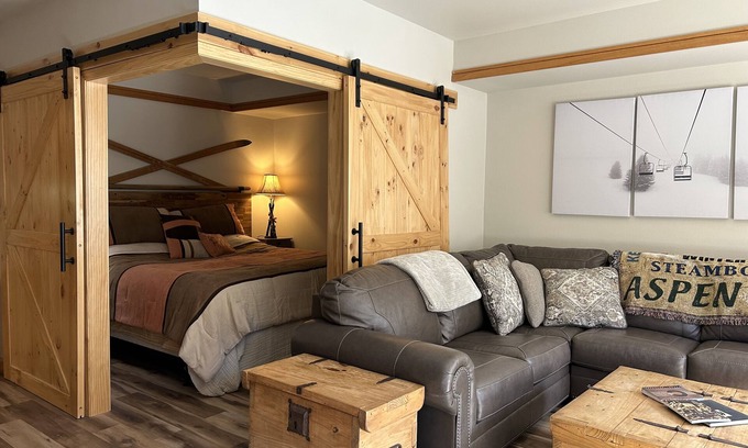 Recently renovated, deluxe studio, walking distance to Peru Lift, Ski School, and Mountain House. Comfy king bed is enclosed by 1/2 walls with barn doors to provide privacy.