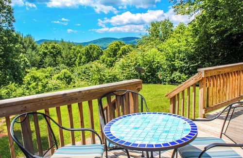 Perched on a quiet ridge surrounded by tall trees and wildflowers, the cabin’s large deck delivers panoramic views of the Blue Ridge Mountains. Lounge in the hot tub, nap in the hammock, or just listen to the breeze and birdsong.