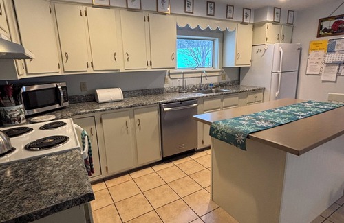 The first floor has the second full bath, and one large main bedroom with a king bed and pullout couch. The main bedroom also has a pack ‘n’ play for toddlers, a rocking chair, a large beanbag chair, and a library stocked with books of every genre for any age. Each bedroom is equipped with a tv, wifi, fresh linens, and plenty of blankets and pillows. The first floor also has a living room, a large family room, as well as a spacious kitchen. The family room includes a substantial set of Legos with their own table, and Melissa and Doug toys and train set that are discretely tucked away.