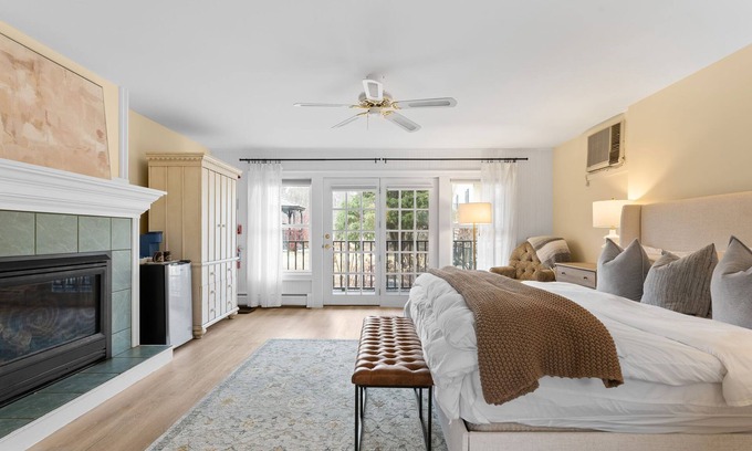 The Fanny Suite is a beautiful, spacious suite, with a king-sized bed, a gas fireplace, large soaking tub lounge (jets not working), TV, two lounge chairs, and private terrace. Located on the ground level, the room is handicapped accessible. This suite has a completely private entrance.