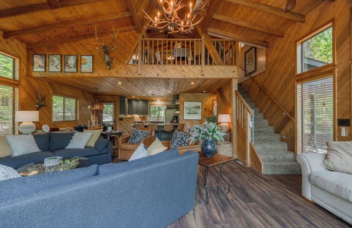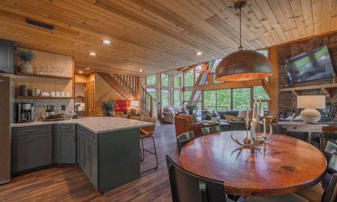 The fully equipped kitchen includes all the cooking essentials plus an elongated breakfast bar with barstool seating, making it easy to enjoy meals together. A separate dining area provides ample space for group dinners, while the upstairs loft offers a quiet sitting nook, access to two additional bedrooms, and a full bathroom. The sleeping arrangements include a main-level primary bedroom with a queen bed, a second upstairs queen bedroom, and a third upstairs bunk room with two sets of bunk beds (2 queens and 2 twins)—perfect for kids or additional guests.