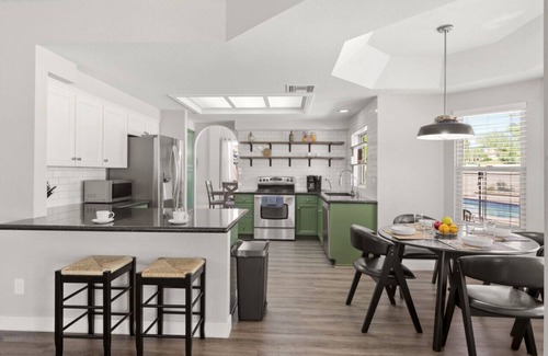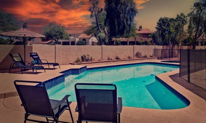 Out in our spacious, fully fenced backyard you can relax under the covered patio or lay out in the sun, poolside! The pool is serviced all year around for our guests to enjoy. We have a propane grill, outdoor seating and cornhole boards for you to enjoy the perfect AZ weather!
