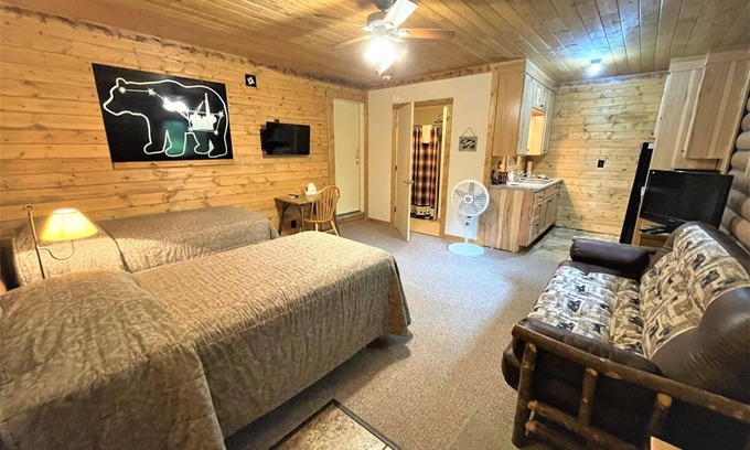 This is an efficiency-style, air conditioned, studio space set for your comfort and enjoyment with a cabin-like feel--a nice cozy getaway! There is one full-size futon and two twin beds. The kitchenette has a refrigerator, microwave, coffee pot, toaster and dishes. The bathroom has a walk-in shower. This is not a full condo. You are allowed access to the dock and the grounds. This property provides a setting with stunning views of Elk Lake, endless fun and relaxation on the 4-lake Phillips Chain of Lakes right from the docks! There's direct access to ATV/UTV & snowmobile trails, a short drive to the nearby golf course, and it's close to town for shopping, parks, & bars/restaurants. Welcome home to your Northwoods retreat!