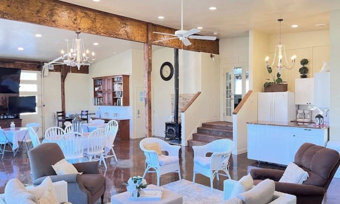 Outdoor lighting and country setting makes the farmhouse rather magical. Lovely outdoor areas as well as the large indoor space with 2 walls that completely open up making it an opulent indoor / outdoor experience.
