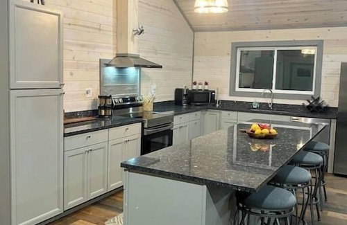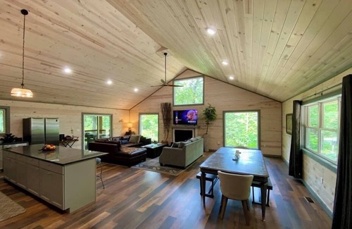 Natural light pours into the greatroom from several 6ft x 6ft picture windows showcasing the forest and a distant cliffline view. The spacious kitchen has a 10 ft island, high end stainless steel appliances, a Vitamix for frozen drinks, stove, refrigerator, oven, dishwasher and all the necessary utensils/cookware/spices. A massive dining table comfortably seats 8 while the kitchen island seats 4.