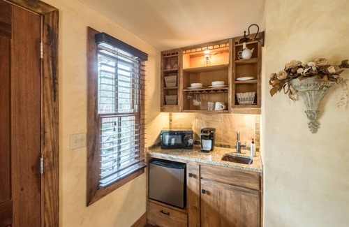 (5) Sunday House (adults only, no pets) - an updated historic representation of the quaint Fredericksburg homes built by the German pioneer ranchers for weekend stays when they came to town for church and supplies. This luxury unit features a king bed with full ADA compliant (wheelchair accessible) bathroom and covered porch with swing and easy wheelchair access to the pool area and Cabana.