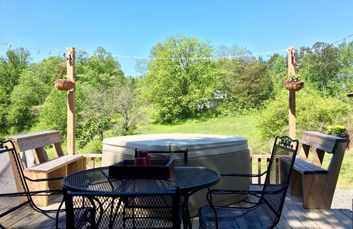 The tiny house is located on our lil farm property and tucked neatly behind another home. It is conveniently located right off Highway 76 West and surrounded by the Chattahoochee National Forest. Simplify and come see what nature has to offer. Note: this is a tiny house not a presidential suite and it can get a little cozy! Also, this tiny house is located on our property and is about 30 feet behind another home and we live at the back of the property along with another tiny house we rent. The hot tub for this property is not shared with other guests and a curtain is provided that can be pulled for added privacy. The porch to the waterfall is a shared area. Security cameras(capable of recording) and owners pets are present on site and cars drive by.