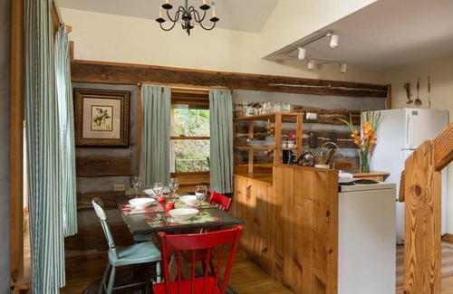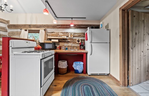 Redbud, the largest cabin on our main property, is perfect for a getaway with friends. This two-bedroom cabin features a king bed and full bath in each room, with one bedroom wheelchair-accessible. Enjoy the cozy gas log stove, a fully equipped kitchen, a covered porch with a swing, and breathtaking forest views. The accessible bedroom includes low bed height, ample space, even flooring, and a shower with a handrail for ease of navigation.