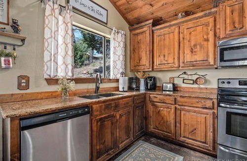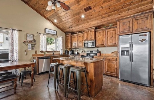 Cabin has spacious kitchen with island. Full laundry room with washer and dryer. Large fire-pit installed with adirondack chairs. Screened in back porch with table seating and tv perfect for fall football and outdoor music.