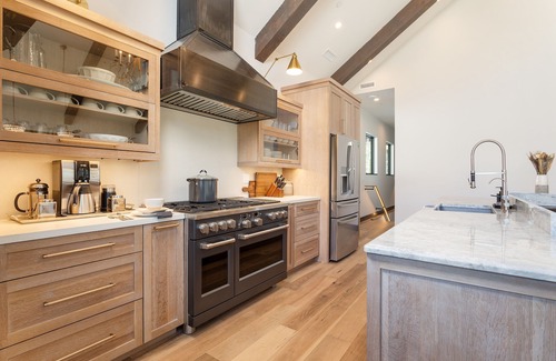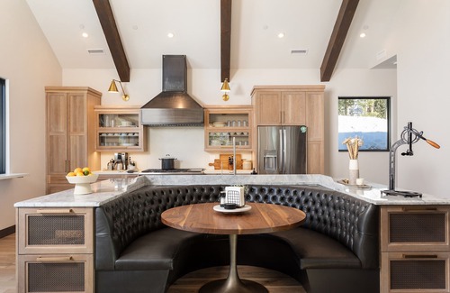 The gourmet kitchen also provides a custom tufted banquette with a round table for quaint gatherings at breakfast or for catching up on some work. If a more formal experience is desired, a comfortable 8 ft, white oak table, that expands to 12 ft, will fill your dining experience with elegance.