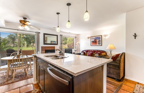 Relax on your patio in the fresh air, then step inside and enjoy the comfort of central air conditioning and heating. The completely updated interior features a modern kitchen with new appliances, as well as fresh paint and newly carpeted floors throughout. Get cooking in the well-equipped kitchen, complete with gorgeous wood cabinetry, a two-seat breakfast bar, and helpful extras like a dishwasher. Gather for special meals at the dining table, or dine alfresco on the patio with serene golf course views. A grill is provided for cookouts.